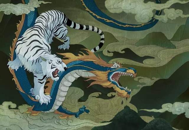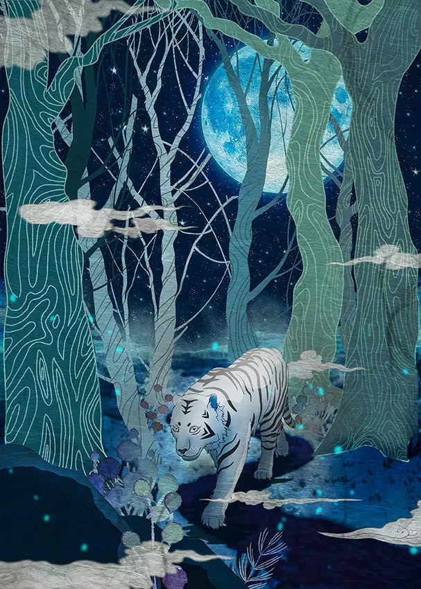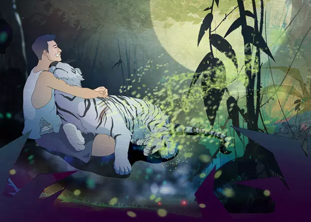 再见是五年之后。男孩长大了,和他田里的庄稼一般长得又快又好。学堂里能背出最多的经典的他,成了当地最被看好的后生。有一次打猎,他追着一只鹿迷失在森林深处,直到傍晚还没有找到回去的路。夜幕降临,四面狼嗥里,他看见一只白额吊睛的老虎披着月光走来。